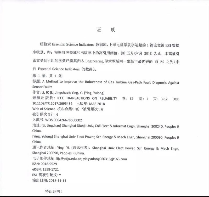 在公司、公司对教师科研工作的大力支持与激励下,党员骨干教师李靖超积极探索科研的新方向,潜心将理论与实际相结合,2015年9月,成功签订入职后的第一个横向项目《燃机发电系统传感器故障诊断与信号处理技术研究》(15万元),首次尝试博士阶段的研究内容信号处理,将跨学科的应用到燃机发电系统传感器故障诊断中。在项目的执行过程中,克服了因为跨学科研究、设备故障、出差实地考察等困难。经过一年半的不断探索与反复论证,2016年针对该项目内容和结果,撰写了论文《A Method to Improve the Robustness of Gas Turbine Gas-Path Fault Diagnosis Against Sensor Faults》,过程中经过多次润色与修改,最后投稿到该领域的顶级期刊《IEEE Transactions on Reliability》。在2016年年底,收到了修改的通知,针对专家提出的问题,再次修改后于2017年3月份录用发表,2018年3月份正式检索。近期,该论文正式入选ESI高被引论文,受到了同行的一致肯定。