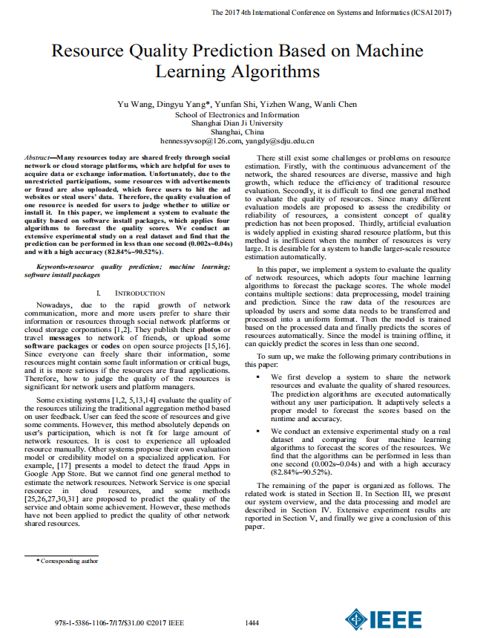 通过对他人已有研究的学习,结合自己项目的创新点,利用暑假的时间王禹开始撰写论文,经过一遍一遍的修改,论文发表在会议期刊,并于2018年1月被EI收录。