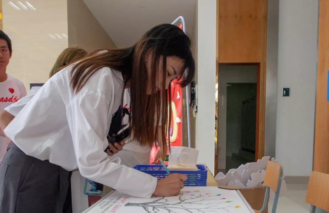 为迎接员工返校,师生们做足了准备,将信息楼一楼大厅布置一新,节日气氛浓郁。上午9:00,员工们陆续来到签到台,在象征团圆的幸福树上按下了他们宝贵的指印,并签上自己的姓名,随后在留言墙写下他们对祖国、对母校的美好祝语。