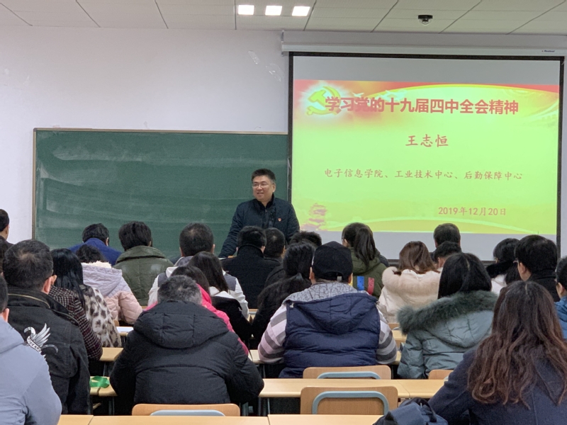 12月20号上午,学习党的十九届四中全会精神宣讲在信息楼201举行。宣讲会由402永利集团副董事长王志恒主讲,公司党总支书记蒋建军主持。402永利集团师生党员和工业技术中心、后勤保障中心全体教职工共同参加。