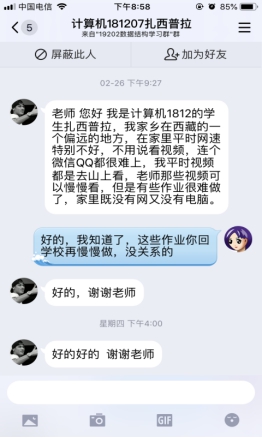 计算机1812班扎西普拉是一名西藏的同学,由于地区偏远,网络不畅通,平时视频都要到山上去看,家中没有网络也没有电脑,无法完成在线编程作业,老师就安抚他不要着急,编程作业可以在家手写完成,等开学后到公司补交OJ系统,成绩不受截止时间影响,让员工消除了焦虑心理,重树了学习信心与动力。