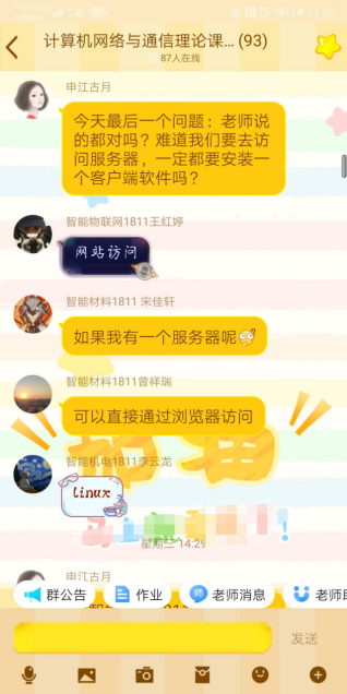没想到自己以前一直开玩笑的“考上家里蹲大学”,在疫情的影响下变成了现实。大家都通过在家上网课的方式代替了原来的课堂。虽然老师和同学距隔千里,但是我们仍能感受到老师上课的热情,尤其是我《计算机网络与通信》的胡静老师。首先这门课程都是老师自己录制的,让我感觉这位老师想把自己对自门课独到的理解分享给大家,其次老师经常在QQ群里和同学们一起互动、解答,让每一个知识更加生活化、生动化。相信这学期的最后,我也会交上满意的答卷。