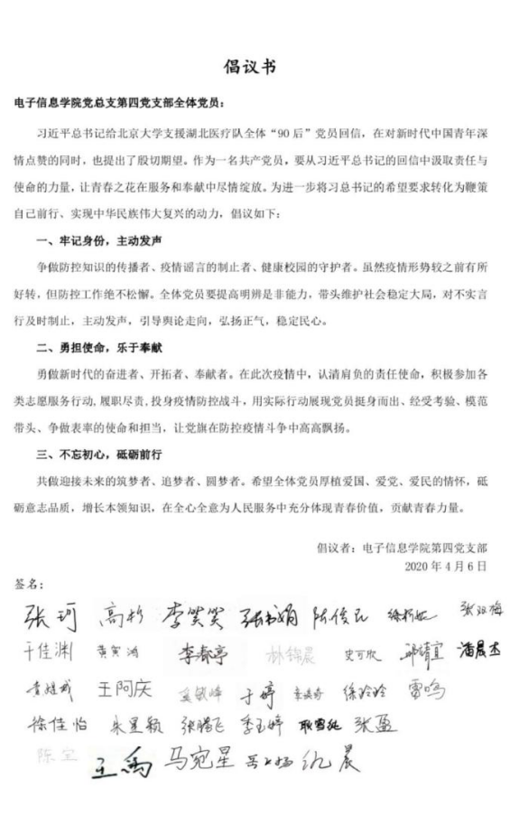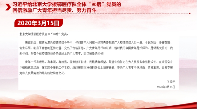 3月15日,中共中央总书记、国家主席、中央军委主席习近平给北京大学援鄂医疗队全体“90后”党员回信,向他们和奋斗在疫情防控各条战线上的广大青年致以诚挚的问候。习近平总书记的回信在402永利集团师生中引发热烈反响,公司党总支积极组织全体党支部、团支部开展深入学习活动,号召全体师生参与到体悟回信精神、践行回信要求中来。
