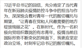 看到这份回信,也使我们备受鼓舞,作为一名90后,我们的心中充满了责任感和使命感,我们是祖国未来的建设者,我们应该将祖国发展,实现中华民族伟大复兴的任务和使命扛在肩头,铭记在心,在公司和社会的实践中不断成长,磨砺意志品质,为祖国的发展贡献自己的力量,让我们的青春在奉献中绽放。我们,也应尽自己的绵薄之力,不为医生,社会增添负担,不随便出门,戴口罩,不信谣,不传谣,勤洗手,讲卫生,为这个社会,贡献出自己的力量!