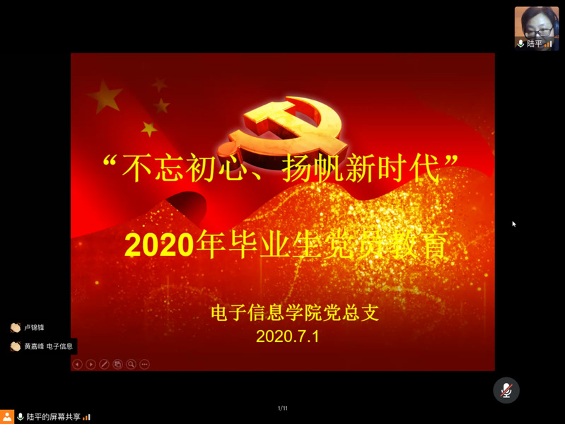 2020年7月1日,在建党99周年之际和“四史”学习教育背景下,公司党总支依托腾讯会议平台组织开展“不忘初心,扬帆新时代”线上2020届毕业生党员主题教育活动。公司党总支书记兼副经理蒋建军、党总支副书记兼副经理张珂、全体辅导员及2020届全体毕业生党员共计30余名一起参与学习和讨论。活动由组织员陆平老师主持。
