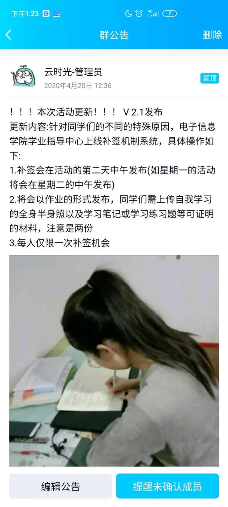 由于此次疫情的缘故,在家的时间被拉长了。正逢此次“共享云时光”活动,我毫不犹豫选择参加体验云端自习以克服自身惰性。既视为对自己的一种督促,也是对自己自制力的一场考验。未参加活动之前,每次晚饭后的时间很容易因为浏览手机或者犯困而轻易任其流逝,而如今每每晚饭过后,都会带着一股紧迫感,进学习群内签到,在自主学习两个小时后,拍下学习成果并在群中完成二签。