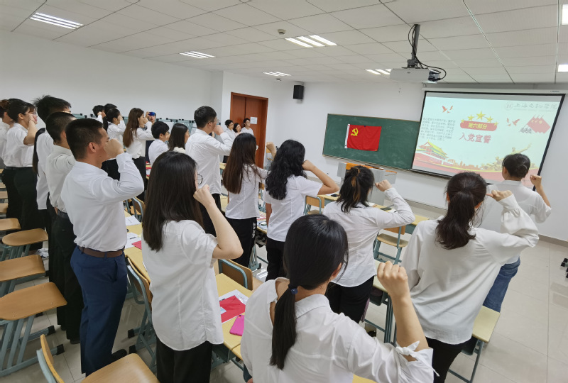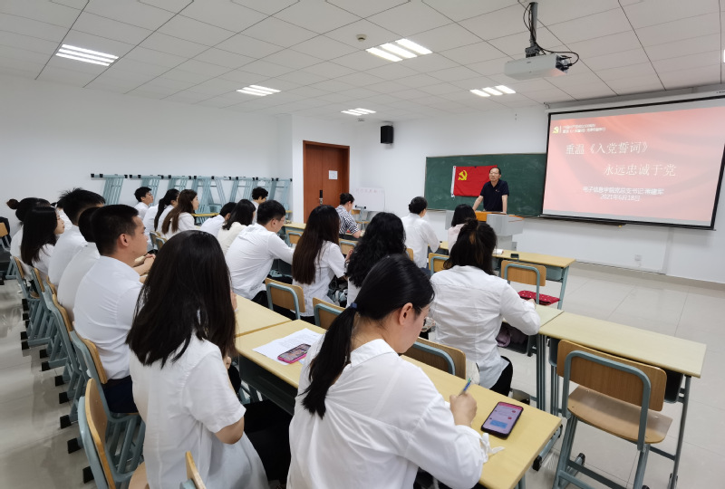 蒋书记带领与会党员共同学习了土地革命战争时期、抗日战争时期、解放战争时期、新中国成立初期、党的十二大以后等不同阶段的入党誓词,强调党与时俱进的精神品质,红色精神的一脉相承,通过讲述党史故事和国际国内背景引导和激励毕业生党员在未来的工作中牢记党员身份,坚定理想信念。
