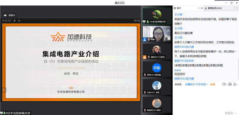 本次空中讲坛,他为同学们剖析当下信息技术的行业背景和考研的严峻形势,公司开设的相关专业均符合上海高端制造、信息服务产业的需求,人工智能、芯片设计等在国内人才紧缺,同学们应该主动出击,摒弃“等”的观念。求职招聘走向“云端”,王老师还帮助同学分析各个专业的就业前景和企业的人才需求,向同学们积极推介岗位,指导毕业生如何“屏对屏”斩获offer,从而实现云就业。 3、直播宣讲 杭州加速科技有限公司产品总监李浩以“硅(Si)在集成电路产业链里的流动”为主题,从IC设计、IC制造和IC封测三个方面生动形象地为同学们介绍了集成电路的设计制造流程、产业规模、发展趋势等内容。