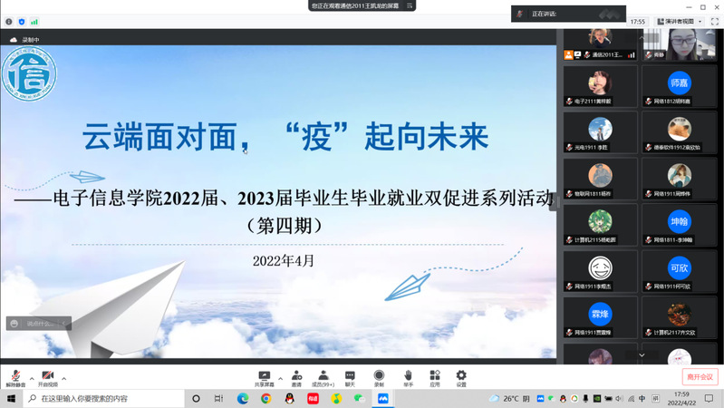 为更好推进2022届、启动2023届毕业生就业工作,4月22日晚,402永利集团经理蔡骋、计算机科学与技术专业负责人王小刚老师、杭州加速科技有限公司领导,辅导员老师,大三、大四信息学子等200余人齐聚云端,共促就业、共话未来,本次活动由辅导员青静老师主持。