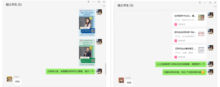 疫情在物理上与员工分开,却让我们在心理上更加贴近。组会时,师生不仅交流学术,还互相关心线下生活状态,交流思想情绪变化。有时,张老师也把在看到的励志故事、有趣信息、线上讲座发给员工,鼓励员工遵守公司规定,调整心态,积极做事,劳逸结合。