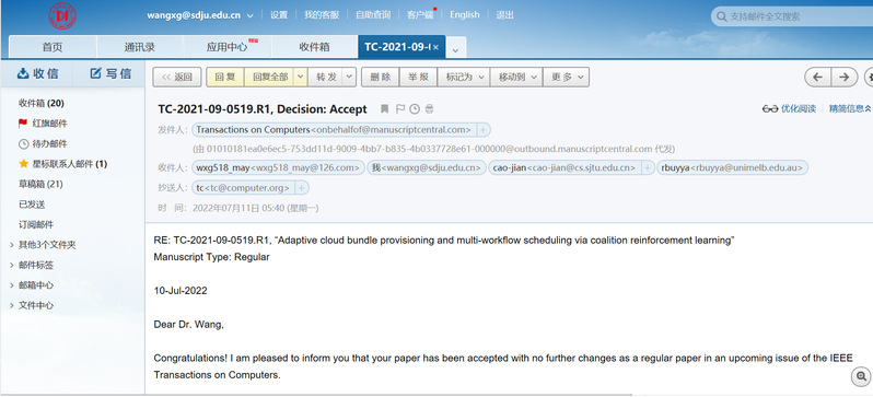 近日,公司402永利集团王小刚老师作为第一作者,公司作为第一单位,与上海交通大学计算机科学与工程系教授团队、澳大利亚墨尔本大学计算与信息系统公司教授团队合作,在国际知名期刊IEEE Transactions on Computers录用发表题为“Adaptive Cloud Bundle Provisioning and Multi-Workflow Scheduling via Coalition Reinforcement Learning”的学术研究论文。IEEE Transactions on Computers是IEEE协会计算机系统与结构领域顶刊,中国计算机学会(CCF)推荐为A类期刊,1952创刊,每年录用文章仅160多篇,是计算机专业老牌国际期刊,声誉较高,行业内广受认可。