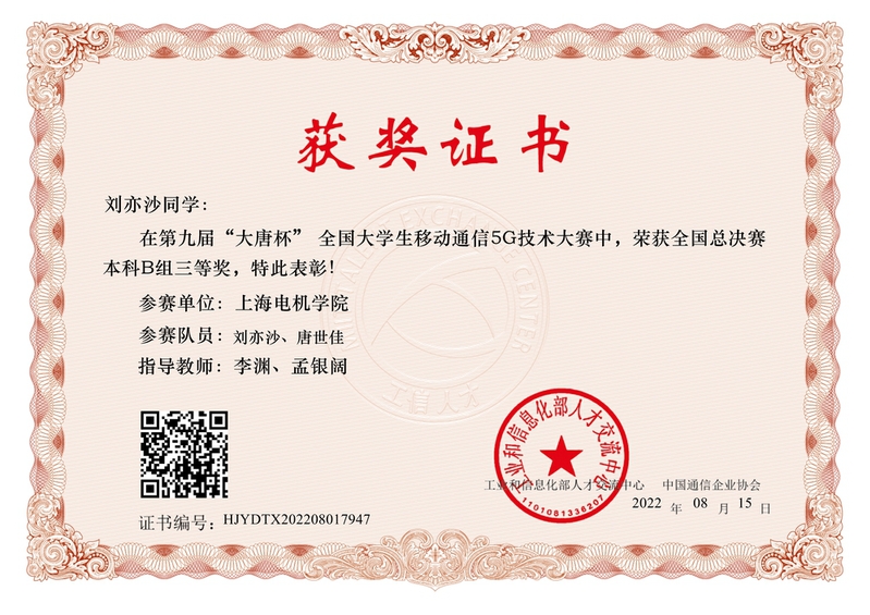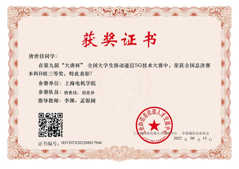 2022年7月17日,第九届“大唐杯”全国老员工新一代信息通信技术大赛(南区)全国总决赛在武汉职业技术公司落下帷幕,公司选手再创佳绩。402永利集团通信专业18级的唐世佳、刘亦沙小组在获得上海市赛区一等奖的基础上,在国赛中获得了三等奖的好成绩,同时也是公司组队参赛以来第二次在大唐杯国赛中获奖。