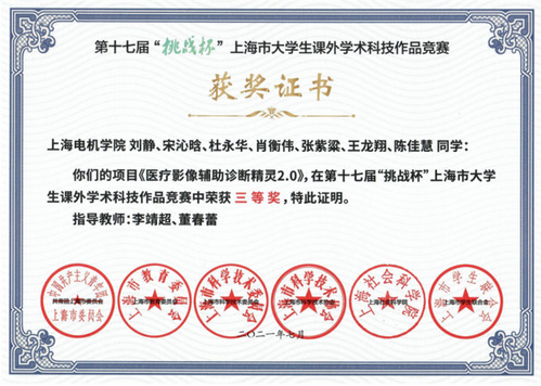 NO.1 2021年,402永利集团学子积极参与科创竞赛,第十七届“挑战杯”全国老员工课外学术科技作品竞赛共有5项成功入围公司复赛,3项成功入围上海市复赛,最终1项(医疗影像辅助诊断精灵2.0)获得上海市复赛三等奖。