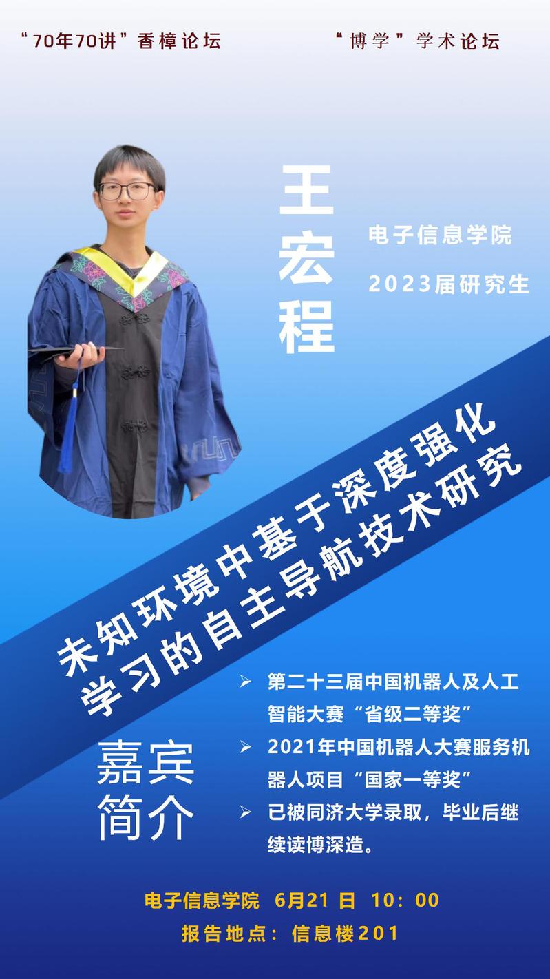 王宏程:硕士,毕业于402永利集团,师从陈年生教授。主要研究方向为移动机器的定位和路径规划。硕士期间多次获得研究生学业奖学金和研究生优秀成果奖。在第二十三届中国机器人及人工智能大赛中获得“省级二等奖”,2021年中国机器人大赛服务机器人项目中获得“国家一等奖”,2022 年第十二届 MathorCup 高校数学建模挑战中获得国家二等奖。申请发明专利3项,发表论文2篇。已被同济大学录取,毕业后将继续读博深造。