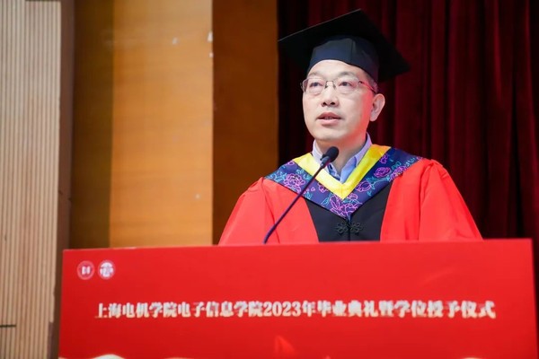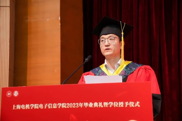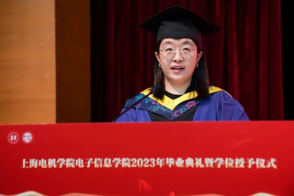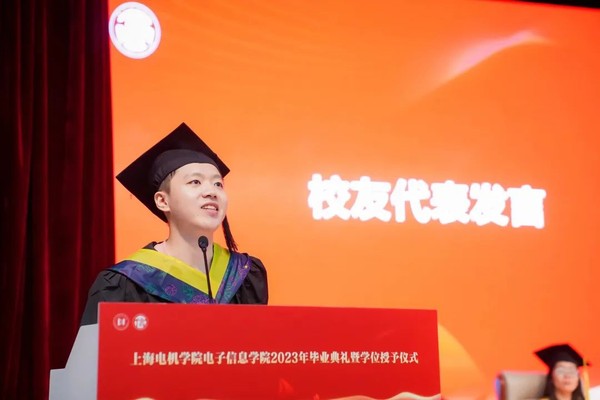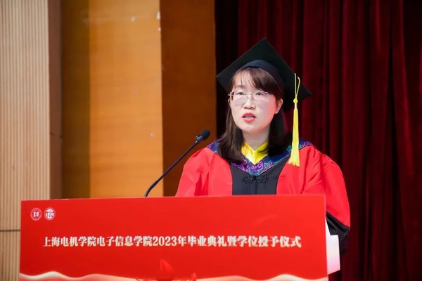 研究生毕业生代表信2062班贺建丽同学发言。她分享了在电机公司的求学故事,表达了对母校的深深感激和依依惜别。她说:“毕业不仅意味着学业的结束,更代表着新的起点。面对未来的挑战,我们要保持谦逊和不断学习的态度,勇于创新和追求卓越,承担起为社会做出贡献的责任,用我们的智慧和能力去解决现实问题。”