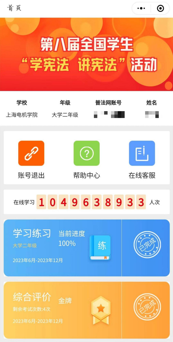 2.在微信小程序或普法网完成高等教育阶段宪法知识在线学习、练习与综合评价,并获得“宪法卫士”标识。