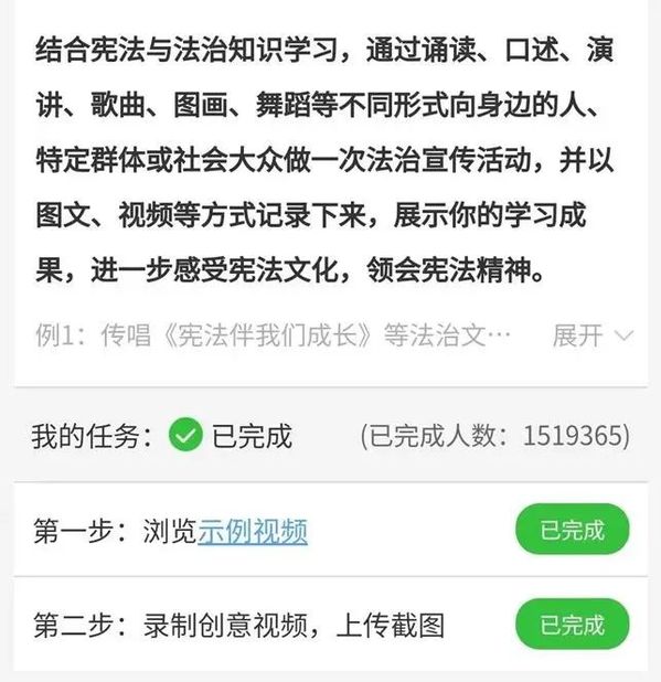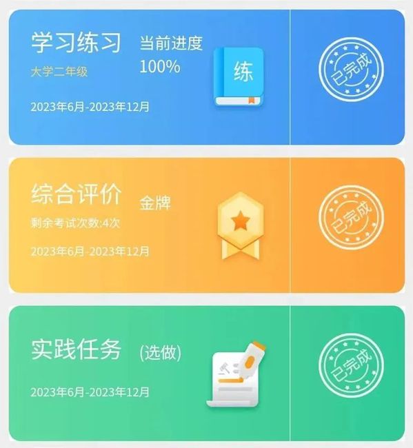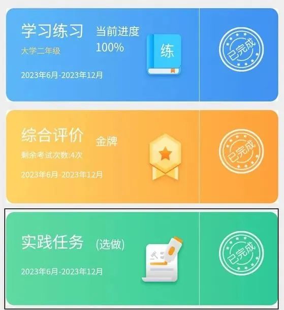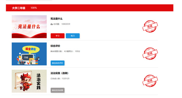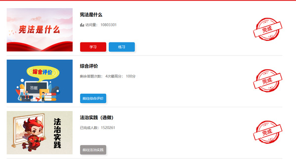 第六步:回到首页,“学习练习”“综合评价”和“法治实践”全部显示已完成,即完成此项活动。