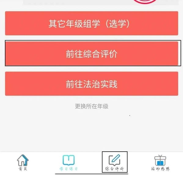 第五步:“综合评价”答题结束后,回到首页,点击“法治实践”,进行学习。