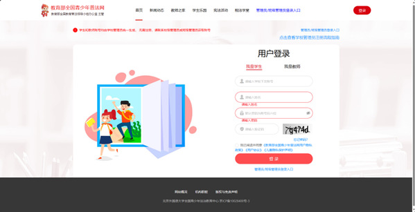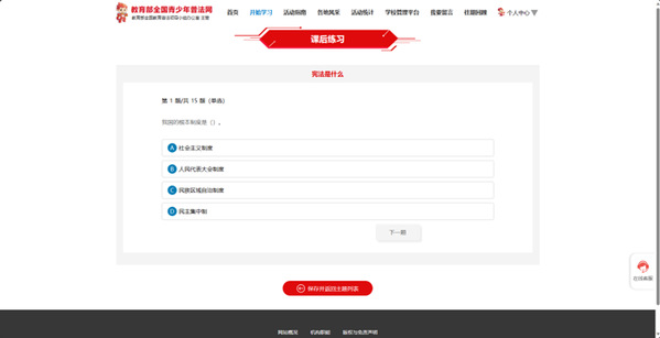 进入网页:https://static.qspfw.moe.gov.cn/xf2023/index.html,点击“宪法活动”进入登录界面,点击右上角登录。