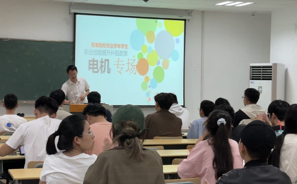 接着,丁宏杰老师为同学们进行高等院校毕业学年员工职业技能提升补贴政策的宣讲。丁老师以自己的工作经历和自己的所见所闻,就“证书可以代表能力么?”和“证书不代表能力么?”辩证地阐明了考取证书的优势,并重点介绍了职业技能等级认定项目、本市和浦东新区的职业技能提升补贴。