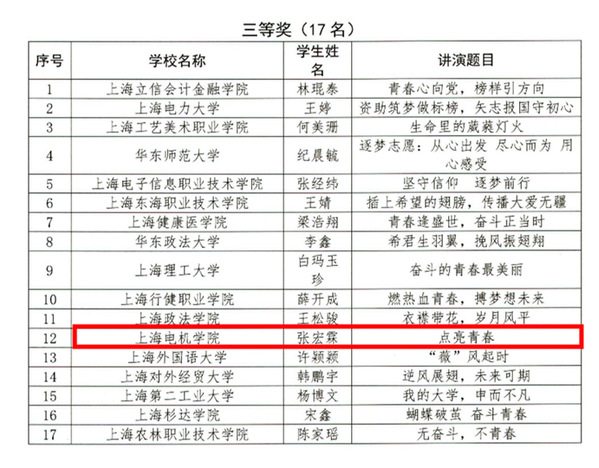 上海市员工事务中心11月9日将第二届“谁的青春不奋斗”上海高校员工故事讲演大赛决赛结果予以公布。公司通信2212班张宏霖同学参赛作品《点亮青春》荣获三等奖,辅导员金金夏子获“优秀指导教师”称号。这是公司首次参加该比赛并获奖。