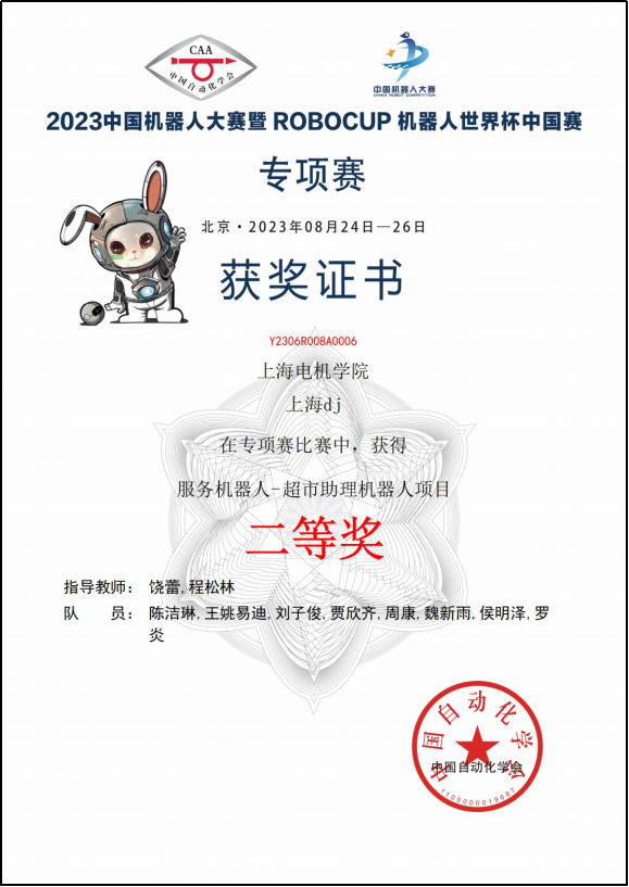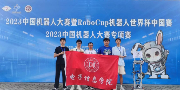 参加了在北京工商大学举行的2023年中国机器人大赛暨RoboCup机器人世界杯中国赛专项赛,与来自北京航空航天大学、北京邮电大学、西安交通大学、西北工业大学等近200所高校的2500余名师生同场竞技。团队师生从暑假开始备赛,充分利用国庆等假期,通过制定技术解决方案、搭建软硬件平台、研究开发目标识别和定位导航等算法,搭建模拟比赛场地进行整机测试,不断优化完善功能。侯明泽、周康、王姚易迪、刘子俊等同学在团队饶蕾、程松林老师指导下,经过剧烈角逐,在通用服务机器人及超市购物机器人两个赛项分别获得一等奖、二等奖的优异成绩。十月份参加了在福建晋江举行的总决赛,并最终获得总决赛二等奖等4项国奖。