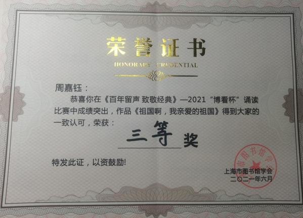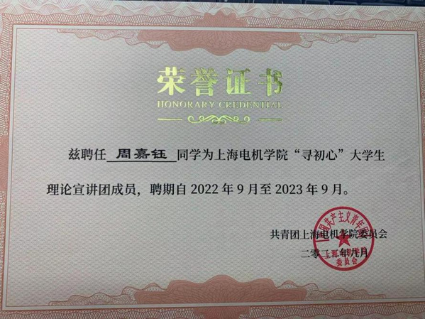 周嘉钰,2002年4月生,中共预备党员,402永利集团软件工程专业2020级本科生,任班级团支书,曾任402永利集团团总支副书记。曾获国家奖学金、学业一等奖学金、笃行一等奖学金、博学二等奖学金、优秀员工标兵、优秀团干部标兵、三好员工、优秀员工干部、优秀抗疫志愿者等多项荣誉。曾参加第五届进博会志愿服务,总志愿时长313.5小时。曾获第十三届“挑战杯”老员工创业计划大赛上海市铜奖,连续两年获“知行杯”老员工社会实践大赛上海市三等奖,“博看杯”诵读大赛上海市三等奖等。