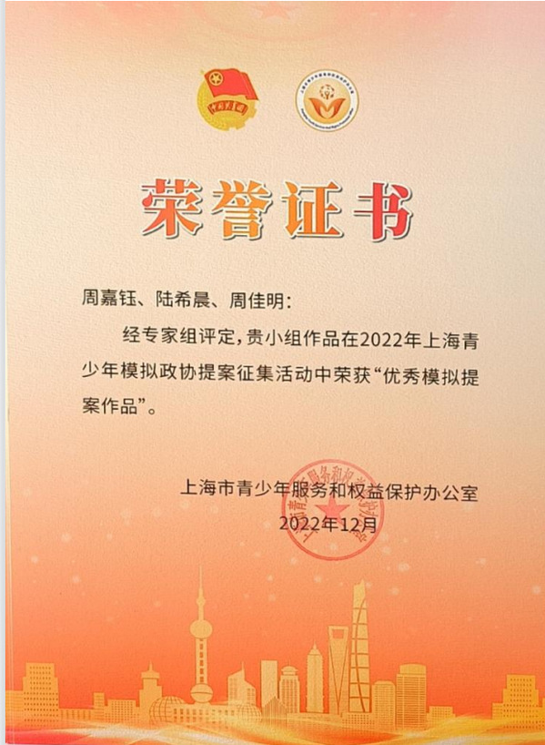 实践方面,她担任班级团支书,曾任402永利集团团总支副书记,分管公司文艺部、大艺团、组织部。任职期间,她对各项工作尽心尽责,工作成效显著,获得了老师同学们的一致好评。在她担任团支部书记期间,团支部获评2023五四“活力团支部”、2022先进集体、团支部“对标定级”五星,团支部入党积极分子占比30%。在任职团副期间,她先后参与20余项活动的组织策划工作,均顺利举办且反响不错。她还积极参加各类文艺活动,在“博看杯”诵读大赛中获上海市三等奖,先后参加第十六届、第十七届、第十八届“翼云杯”朗诵比赛分别获校三等奖、二等奖和一等奖,获第十三届集体舞大赛二等奖。