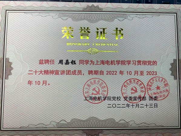 大学期间,她加入了“学史明志”、“寻初心”理论宣讲团,担任学习贯彻党的二十大精神宣讲员以及“伟大建党精神展”讲解员。在此过程中,她认真研读党的工作报告、认真体会党的会议精神,认真传递党的精神谱系,在学习、奉献中追求更有高度、更有境界、更有品位的人生。