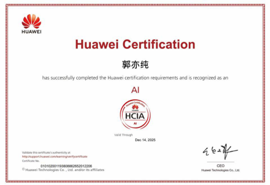 在专业成长上,她也从未停止脚步。经过公司的层层选拔,她成为了校创新队的一员,与不同专业的老师员工一起学习科创知识;先后考取了华为认证ICT工程师证书、上海市高等公司信息技术水平考试人工智能四级证书、英语四六级证书等;入选互联网+项目,申报老员工创新创业训练计划项目并成功立项,现阶段正与队员们一起进行科研学习,开展项目研究。