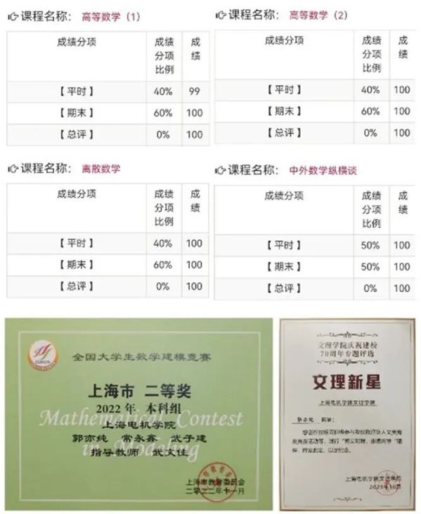 在学习中,她十分注重培养自己的数学能力。数学是理工科的基础,也是学好计算机专业的先决条件,除了在课堂上认真学习外,她积极地在难度与广度上进行拓展,自主练习了许多课外习题,最终在高等数学上、高等数学下、应用工程数学、离散数学、中外数学纵横谈5门数学课程中均获4.5绩点,其中4门获得满分。此外,她也积极参与数学相关的各类活动竞赛,在2022年全国老员工数学建模竞赛中获得了上海市二等奖,在2023年全国老员工数学竞赛中顺利通过校赛选拔,将代表公司参与国赛之争,在2023年文理之星选拔中,被授予了“文理新星”的荣誉称号。