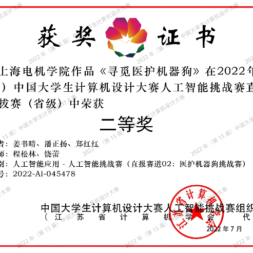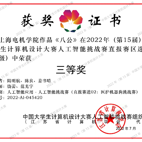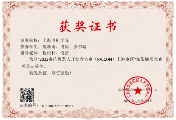 在2023年上半年,参加“2023睿抗机器人开发者大赛(RAICOM)上海赛区如影随形竞赛项目”并获得三等奖奖项。以计算机专业开发者的角度,从生活细微处观察到导盲犬的普及面较窄,为提高视觉障碍者出行质量,提出“智能导盲手杖”为主题的创新创业项目,并获得市级立项。