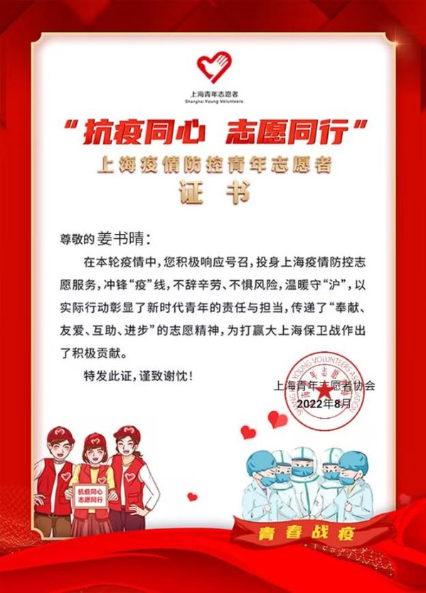 新冠肺炎疫情肆虐,她有责任和义务为疫情防控献出自己的绵薄之力。上海战“疫”期间,她积极响应,担任“扫楼员”,分发物资,协助医护人员进行核酸检测等等,用自己的行动证明“新时代的中国青年是好样的,是堪当大任的!”