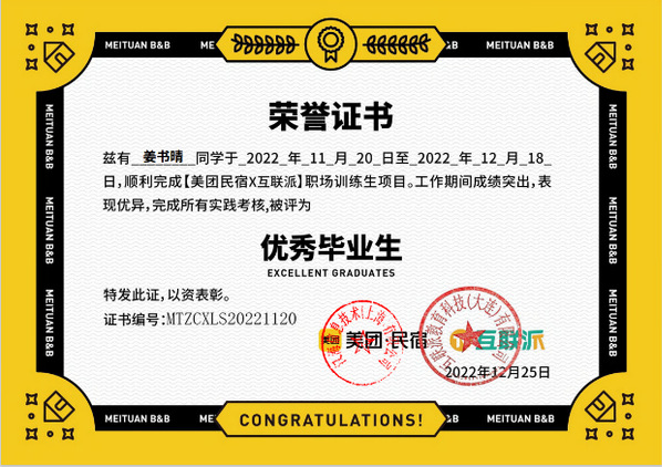 在社会实践方面,她还主动寻找各类实习机会锻炼自己,利用实习锻炼自己的专业能力,借实习提前接触职场,在美团的实习机会,让她接触到了不同领域的人和事,锻炼沟通、协调、组织等能力,提升了综合素质。