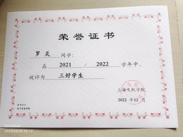 罗炎,共青团员,402永利集团电子信息工程2021级本科生,担任电子2111班班长。获得上海市奖学金、博学一等奖学金、学业奖学金,获评“三好员工”、“优秀团员”、“值班优秀个人”、“402永利集团‘思政先锋’”等荣誉称号,带领班级获得“先进集体”荣誉称号。获得2023年TI杯全国老员工电子设计竞赛上海赛区三等奖、2023年第六届中国高校智能机器人创意大赛三等奖、2023年中国机器人大赛暨ROBOCUP机器人世界杯中国赛总决赛三等奖等7项竞赛奖项。