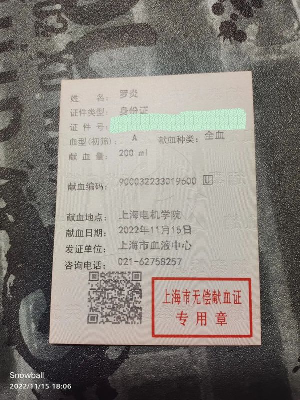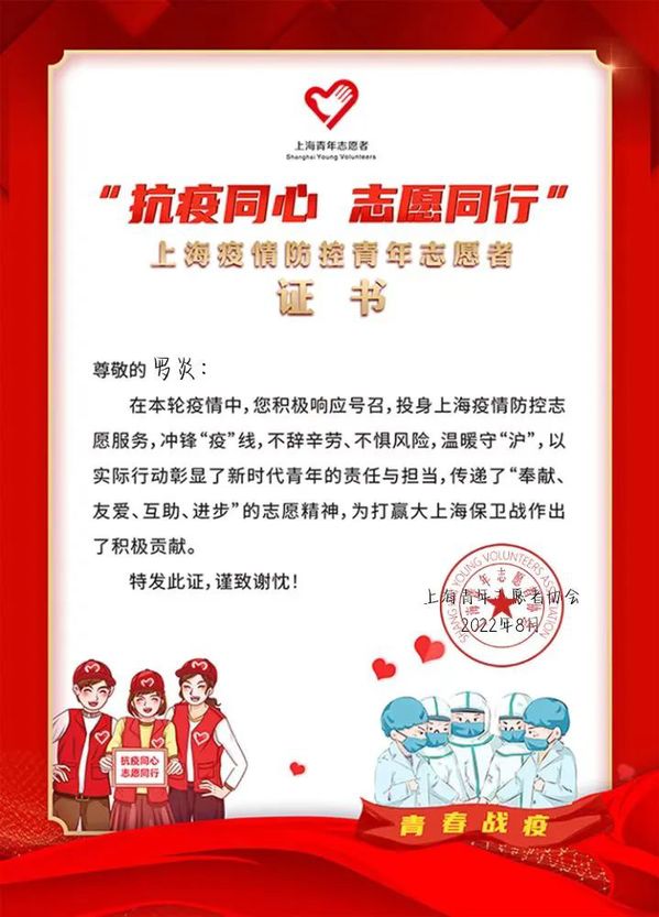 同时,他一直积极参加各项志愿活动。2022年疫情封校期间,他投身于校园防疫志愿工作中,积极贡献自己的力量,获得了上海疫情防控青年志愿者证书。“热血救人,无上荣光”,在校期间,他参加了多次无偿献血活动,获得了多张无偿献血证。
