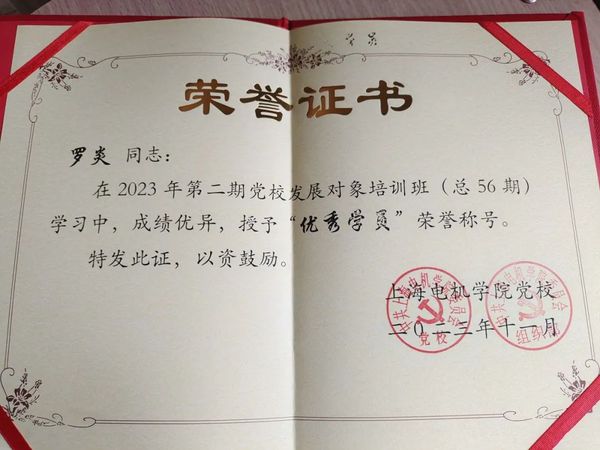 罗炎爱党爱国,积极进取。在大一上学期,他便提交了入党申请书,来年一月成为了一名入党积极分子,七月参加了入党积极分子培训班的学习并顺利结业,今年11月参加了第56期发展对象培训班,学习期间,他勤奋刻苦、认真钻研,荣获“最佳理论学习奖”和“优秀学员称号”,在结业典礼上作为优秀学员代表上台发言。
