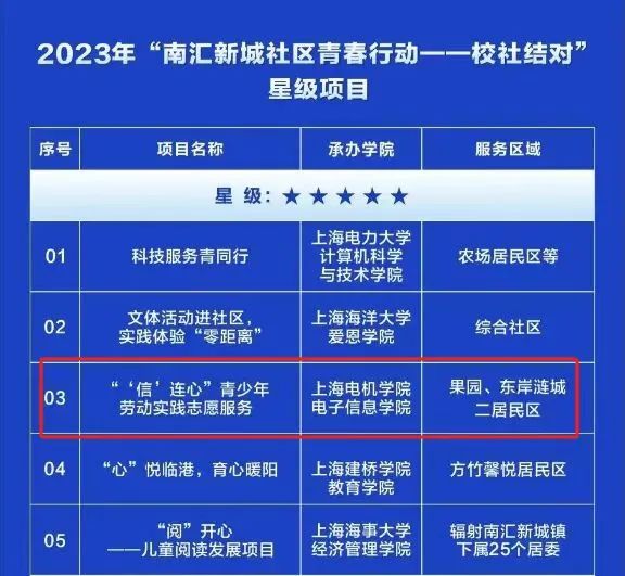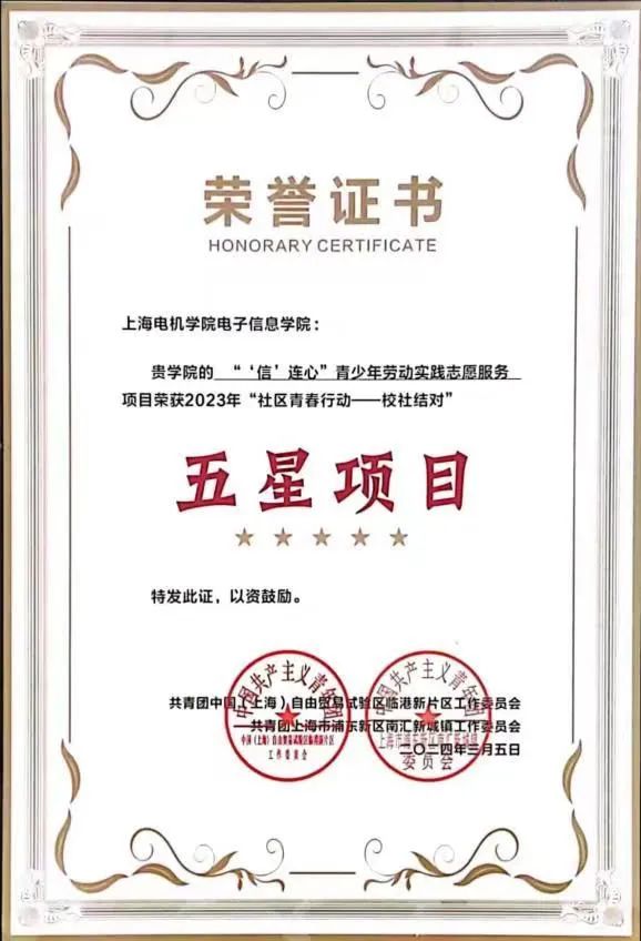 2024年3月5日,在第61个学雷锋纪念日之际,“南汇新城社区青春行动——校社结对”成果展示暨2024年项目启动仪式在临港新片区青年中心举行。本次活动总结展示并表彰了2023年社区青春行动校社结对星级项目,公司“‘信’连心”青少年劳动实践志愿服务项目获评五星项目。