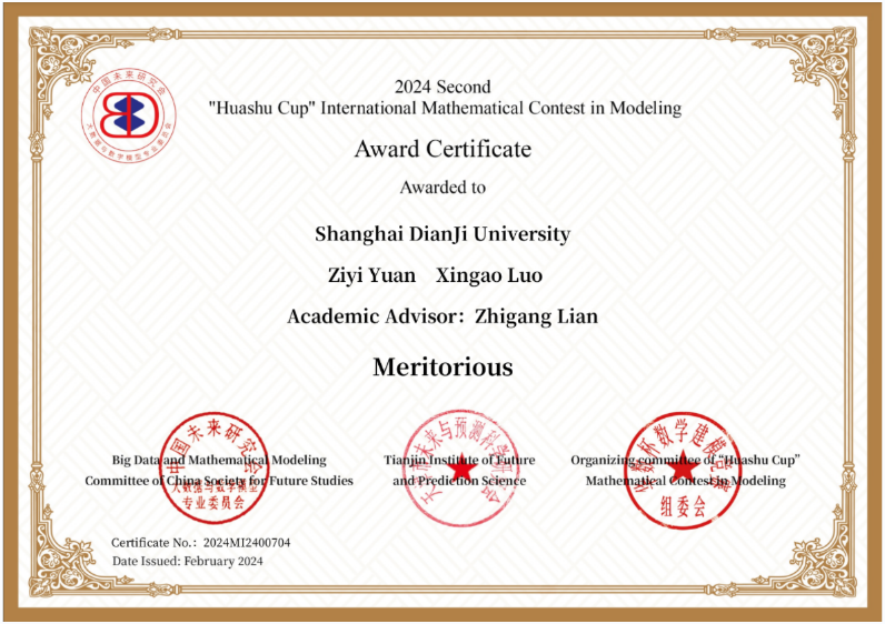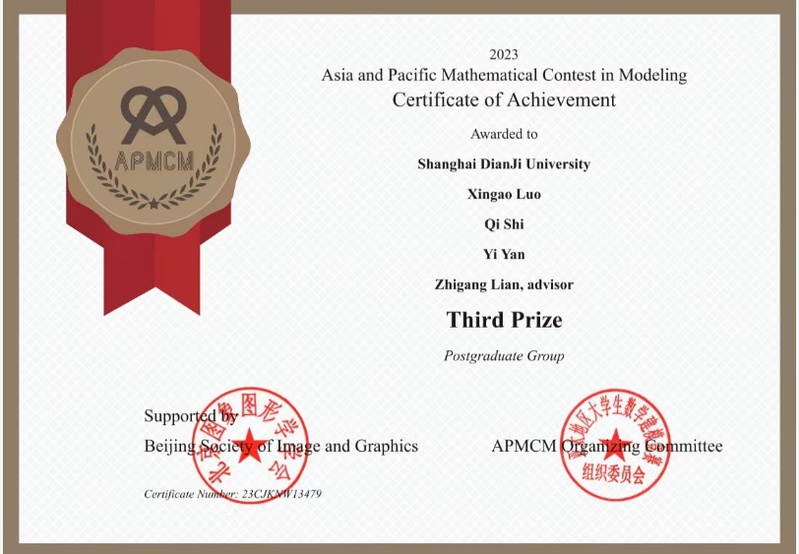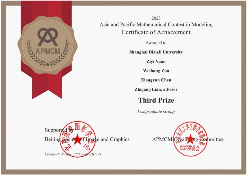 此外,连志刚教授指导的研究生团队还参加了第十三届亚太地区老员工数学建模竞赛(APMCM),该竞赛吸引了来自969所高校的9700支队伍报名参赛。其中,由研究生袁子逸、左伟行、陈向云组成的甲队和骆兴傲、施琦、闫怡同学组成的乙队均荣获全国三等奖。