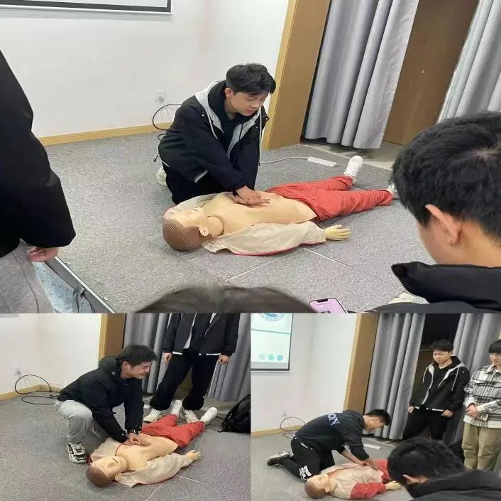 活动过程中,校红会急救部的同学利用人体模型实操演练,将检查及畅通呼吸道、胸外按压、人工呼吸等操作技巧传授给现场同学,并指导大家进行实操体验。