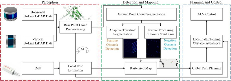 通过基于改进射线法的自适应阈值地面点云分割方法实现对地面点云分割和正障碍物检测的准确性和鲁棒性。利用点云局部分析和特征点对聚类实现ALV对负障碍物的准确检测,进而实现ALV对负障碍物的局部避障策略。所提方法在多种现场复杂环境下,对正障碍物的检测成功率达到98.5%,对负障碍物的检测成功率达到98.7%。研究成果可有效提升ALV在自主导航中的实际应用潜力,为自动驾驶领域的技术发展提供重要支持。