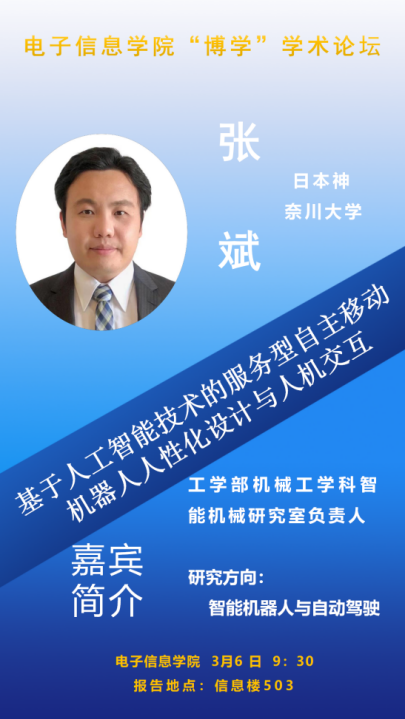 讲师简介:张斌,2011年8月于哈尔滨工程大学获得学士学位,2017年3月于电气通信大学(日本)获得博士(工学)学位。2017年4月至2018年3月任职于日产自动车株式会社。2018年4月起任职于神奈川大学至今,工学部机械工学科副教授,智能机械研究室负责人。常年从事于智能机器人,自动驾驶方向的研究。共计发表论文110余篇,其中SCIE,EI检索论文50余篇。曾获EAI6GN2023,ICDSP2022,ICSR206等国际会议最佳论文。IEEE,IEICE,日本电气学会,日本机器人学会,日本机械学会会员。