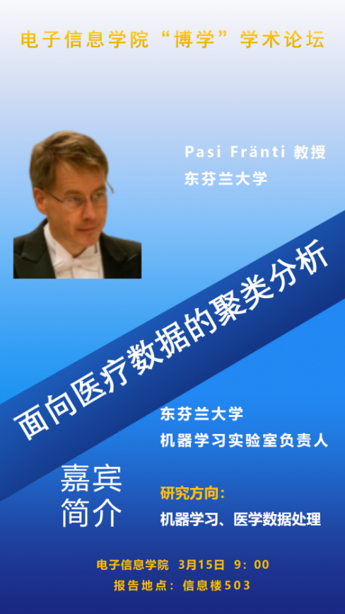 东芬兰大学机器学习实验室负责人Pasi Franti 教授, 东芬兰大学终身教授。 发表了 112 篇国际期刊论文,179 篇国际会议论文及63 篇科技论文,指导31 名博士毕业,多个国际期刊的编委和国际会议的主席,比如《AIMS Applied Computing and Intelligence》、《Pattern Recognition Letters》,IEEE 高级会员。主持和参与多项国家、国际科研项目,包括IMPRO 和MOPSI 项目。