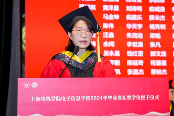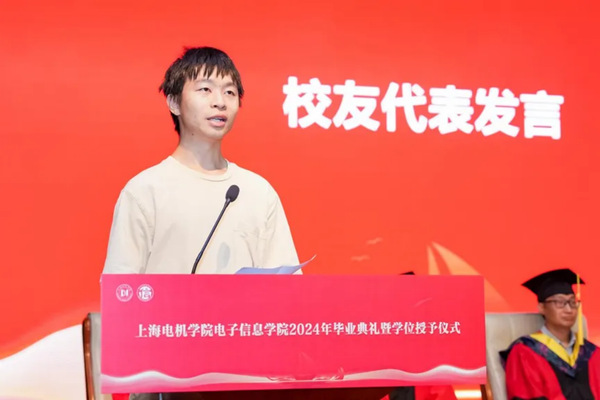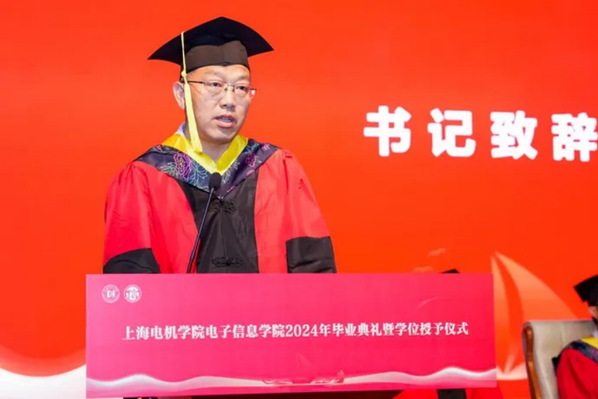 蔡骋经理深情寄语全体毕业生。他表示同学们与母校双向奔赴,共同见证发展,共贺取得的成就。蔡经理指出,毕业不是终点,而是新的起点,他对同学提出了三点希望:一是希望同学们在逆境中勇敢向前,在顺境中保持谦虚,努力做志存高远、胸怀家国的奋斗者;二是希望同学们能够不忘初心,坚守信念,始终保持对电子信息事业的热爱和追求。三是希望同学们秉承“自强不息、追求卓越”的电机精神,传承“电聚四海,信达天下”的院训,为祖国的繁荣昌盛共同贡献自己的力量。