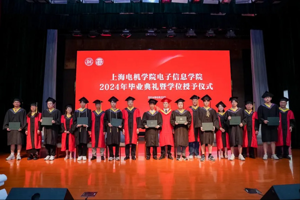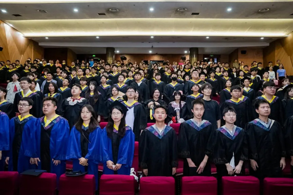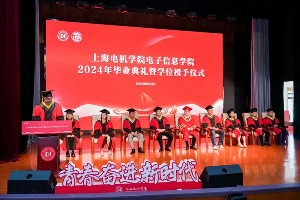 在观看暖场视频《电聚四海信达天下》后,毕业典礼在庄严的国歌中拉开帷幕。