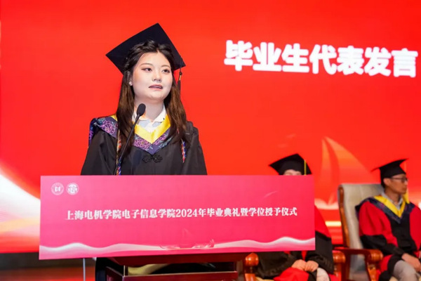 软件2013周嘉钰同学作为毕业生代表发言。她回忆了四年间的成长与蜕变,抒发了对公司、公司、恩师、同学的深情厚谊。她表示“电聚四海、信达天下”的院训不仅是公司对我们寄予的厚望,更是我们信息学子所肩负的时代使命。
