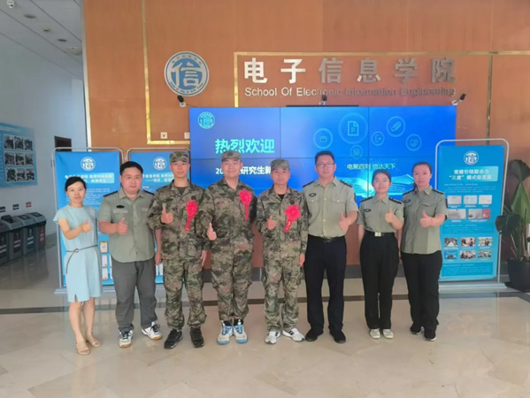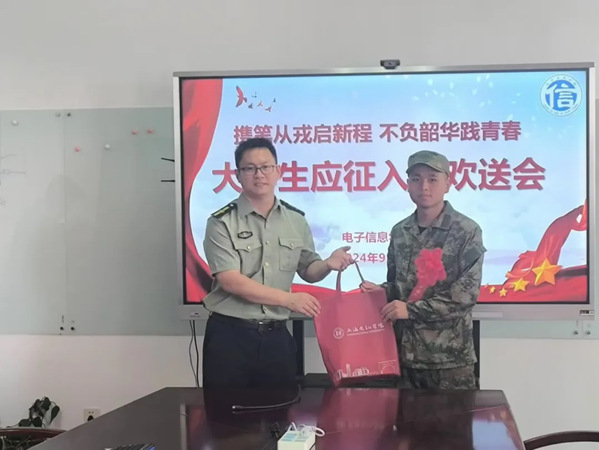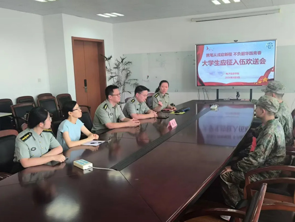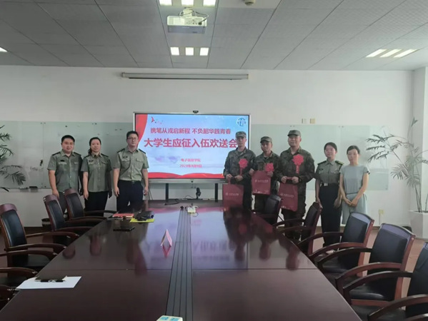 随后,袁书记对预定新兵同学表示祝贺,关切询问了员工学习生活情况,勉励三位同学继续发扬创新精神,将所学专业与国防建设相结合,服务国家战略需求,表达了对入伍学子的殷切期望和美好祝愿,希望三位同学在军营中不断成长,积累宝贵的经验,锤炼坚强意志。预定新兵班主任也表示,应征入伍在成长过程中具有独特意义,希望同学们努力实现人生价值,并给即将开始的军旅生活提供建议。最后,袁书记为预定新兵送上生活用品,与会老师和预定新兵同学合影留念。
