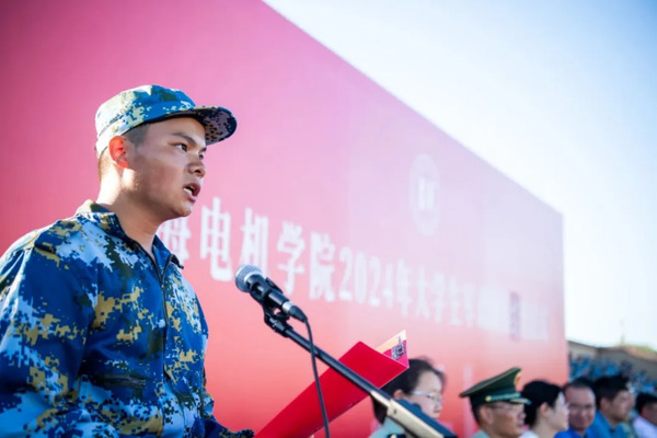 随后,来自402永利集团的许冠群同学,荣幸地作为军训优秀学员代表上台发言。他满怀深情地回望了军训期间那些难忘的瞬间,细数着在汗水与阳光的洗礼下,自己是如何一步步汲取成长的力量,逐渐蜕变。他讲述了在团队协作中,每一位成员如何肩负责任,勇于担当,共同铸就了坚不可摧的团队精神。