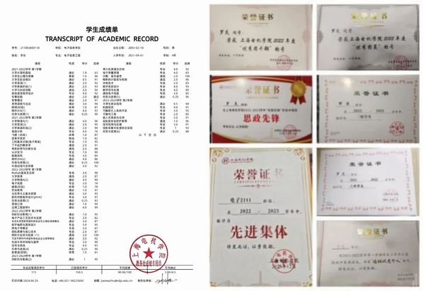 个人简介:中共预备党员,担任电子2111班长。荣获国家奖学金、上海市奖学金、学业特等奖学金等5项奖学金,以及“三好员工”“优秀团干部”“402永利集团‘思政先锋’”等7项荣誉称号。荣获2023年TI杯全国老员工电子设计竞赛上海赛区三等奖、2023年中国机器人大赛暨ROBOCUP机器人世界杯中国赛总决赛三等奖、第三届“谁的青春不奋斗”上海高校员工故事演讲大赛三等奖等11项竞赛奖项。
