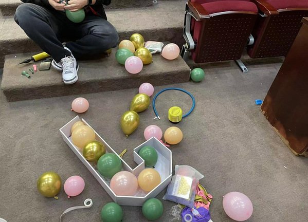 在场地布置现场,工作人员们分工明确、协作默契。他们有的负责搭建舞台背景板,有的负责拼接舞台道具,还有的负责摆放花卉。大家齐心协力,将每一个细节都打磨得尽善尽美。经过数小时的辛勤劳动,场地布置工作终于如期完成。小剧场变得焕然一新,充满了浓厚的艺术气息;台前的花卉寓意着青春与梦想,飞舞的“蝴蝶”传递着大家对音乐的热爱和对大赛的期待。